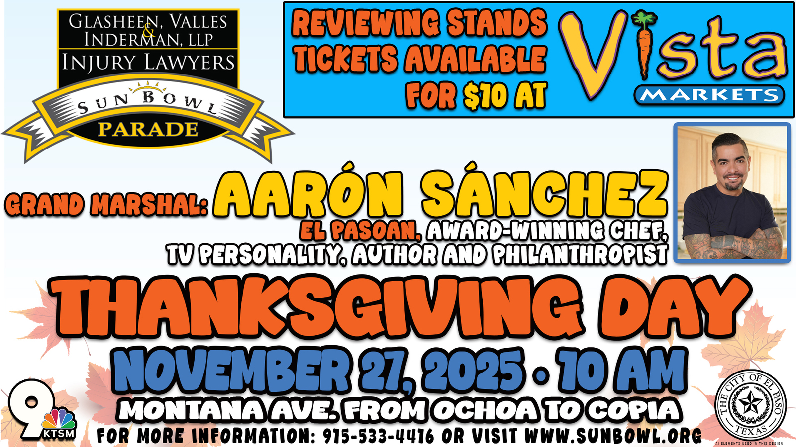 Sponsored by Glasheen, Valles, & Inderman Injury Lawyers, the Sun Bowl Parade has grown to the largest community event in the Southwest. The first parade was organized in 1935 and held on New Year’s Day in 1936. By 1978 the Parade had moved to Thanksgiving Day. Fully planned and coordinated by volunteers, the Sun Bowl Parade presents a thrilling line up of over 100 different floats, equestrian units, marching bands, military ceremonial units, Mexican and Indian dance ensembles, drum and bugle corps, and local celebrities.