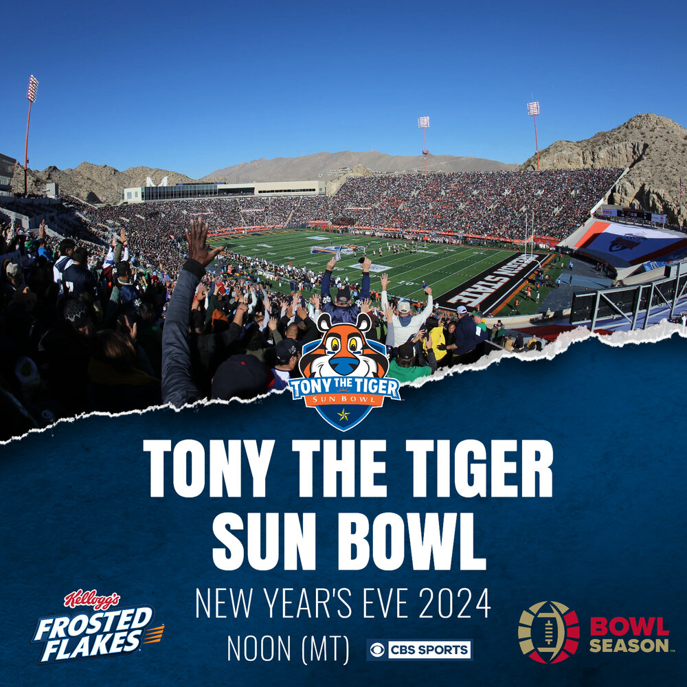EL PASO, Texas – The Sun Bowl Association, Kellogg’s and CBS announced on Thursday, June 6, 2024 that the 91st Annual Tony the Tiger Sun Bowl Game is scheduled to be held on Tuesday, Dec. 31, 2024, at Sun Bowl Stadium in El Paso, Texas. The game will kick-off at Noon (MT) and be televised on CBS for the 56th consecutive year, which is the longest running partnership between one bowl game on one network.